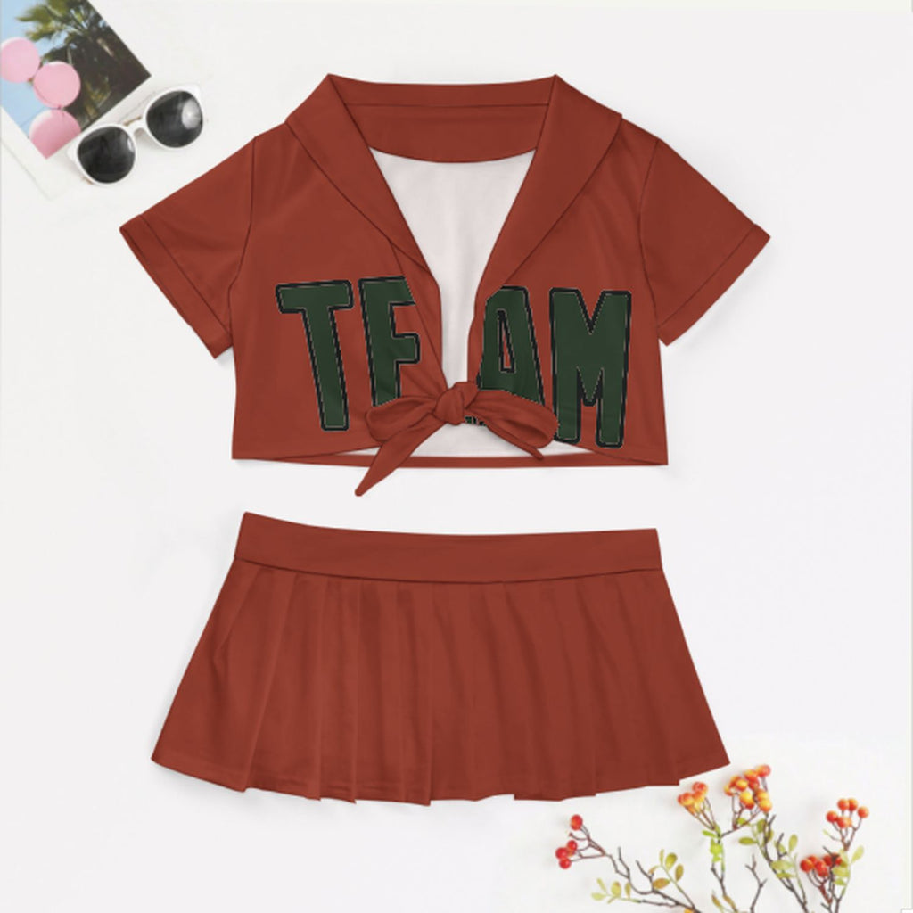 Custom Coral Red Dark Green Cheerleading Uniform Set