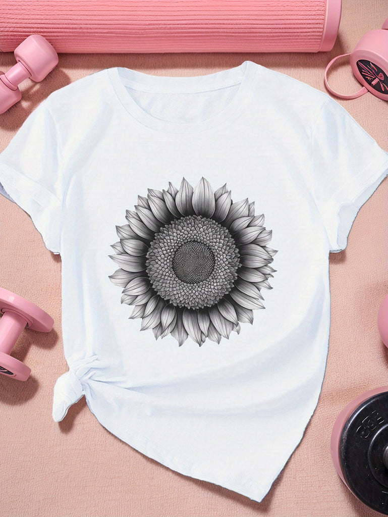 Graphic Shirts For Women Detailed Sunflower Illustration In Black And White On Plain Fabric Sunflower, Graphic Tshirts Women, Cute Graphic Tees For Women