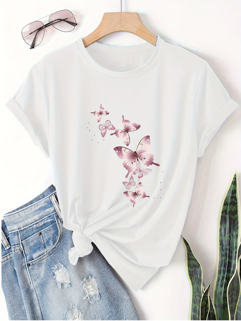Green Shirt Womens Delicate Pink Butterflies Flying Among Soft Blooming Flowers Tshirt, Women Tshirts, Cute T Shirts For Women
