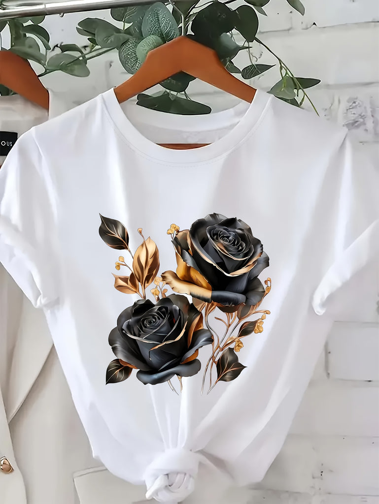 Grey T Shirt Womens Black And Gold Elegant Roses With Delicate Leaves And Graceful White T Shirt, Womens Graphic T Shirts, Womens Graphic Tees Vintage