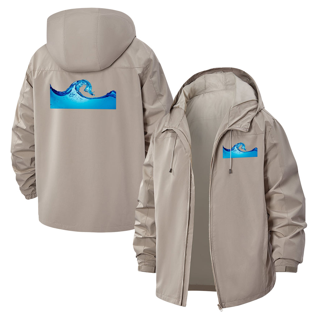 Ocean Wave Motif Unisex Full-Zip Printed Waterproof Hooded Windbreaker