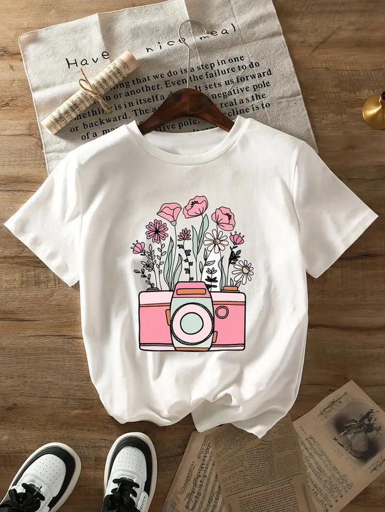 Black T Shirt Women Cute Retro Vintage Pink Camera With Blooming Wildflowers White T Shirt, Cute Graphic Tees For Women, White Cotton Shirt Women