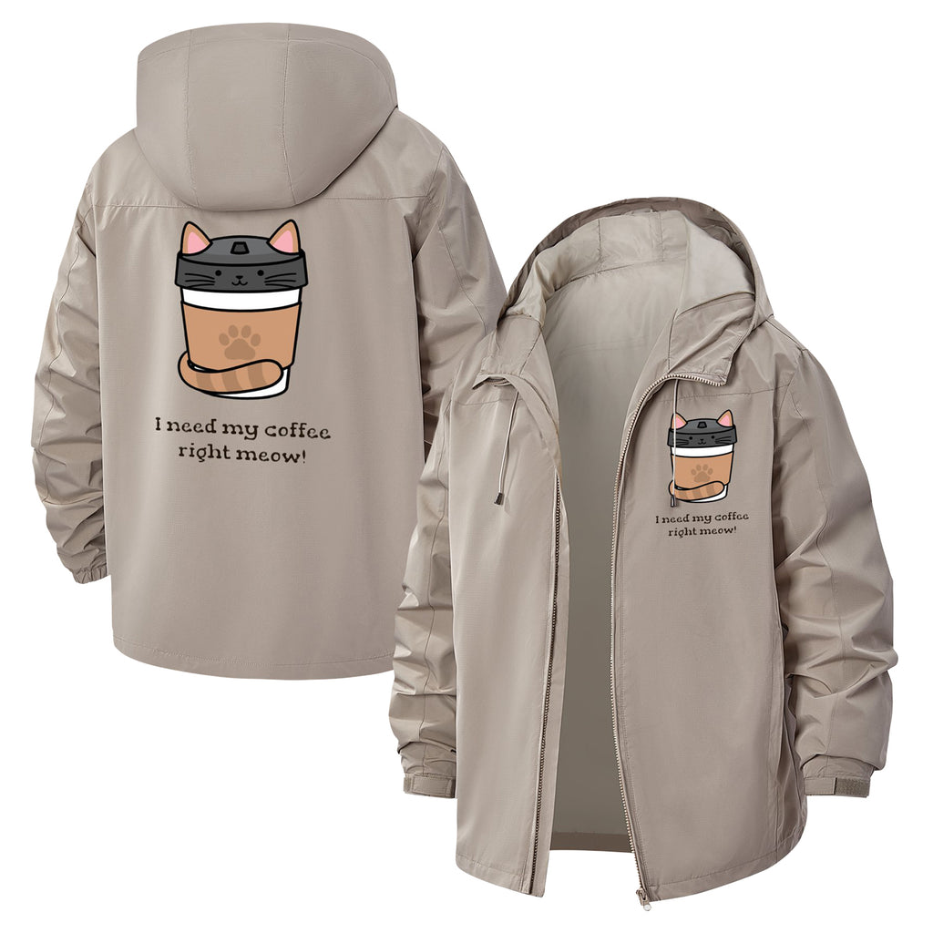 Coffee Cat Cartoon Unisex Full-Zip Printed Waterproof Hooded Windbreaker