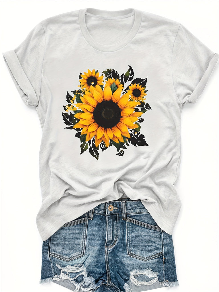 Cotton T Shirts For Women Bright Yellow Sunflowers With Detailed Leaves On Soft White Fabric T Shirt, Womens Graphic Tees Vintage, Womens T Shirts