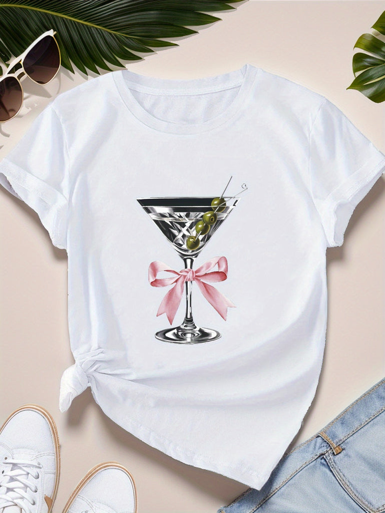 Cotton T Shirts For Women Elegant Glass With Pink Ribbon And Olive Garnish Tshirt, Graphic Shirts For Women, Graphic Tshirts Women