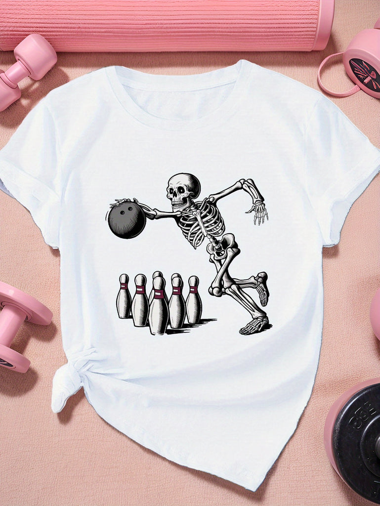 Cotton T Shirts For Women Skeleton Bowling Ball Rolling Pins Down White Cotton Tshirt, Vintage T Shirts Women, Green Shirt Womens