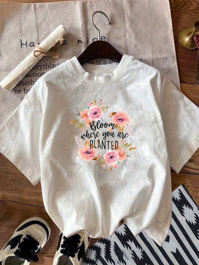 Cute Graphic Tees For Women Blooming Pink Flowers Surrounding Motivational Text Elegant Tshirt, Pink Shirt Womens, Womens Grinch Shirt