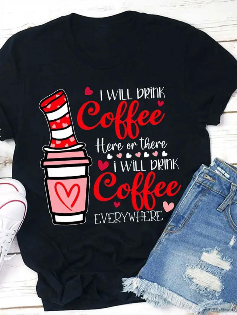 Cute T Shirts For Women I Will Drink Coffee Here Or There I Will Drink Coffee Everywhere Coffee Cup With Red Hearts And Steam On Black Shirt, Graphic Shirts For Women, Blue Shirt Women