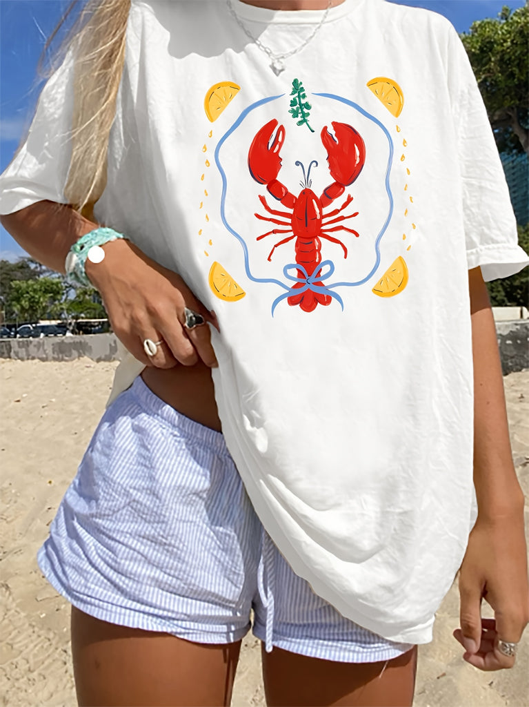 Funny T Shirts For Women Bright Summer Day With Marine Elements Featuring Lobster, Womens White Tee, Cute Graphic Tees For Women