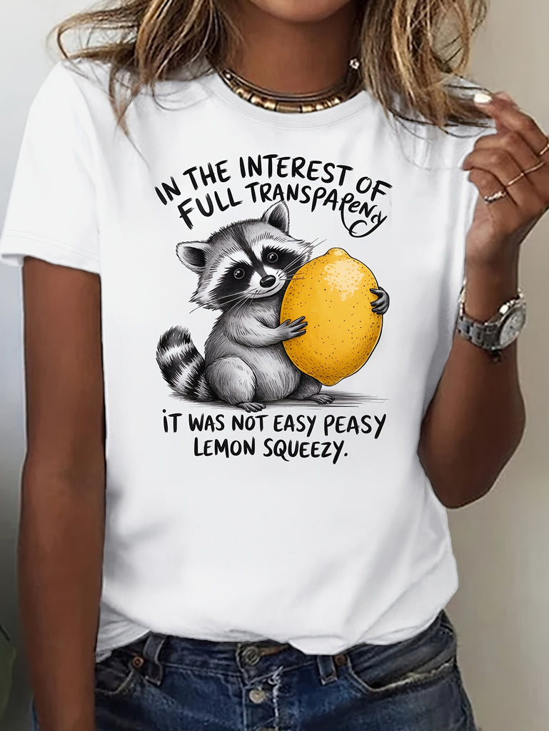 Funny T Shirts For Women Full Transparency Playful Raccoon Hugging Large Bright Lemon Fruit, Womens T Shirts, Women T Shirt
