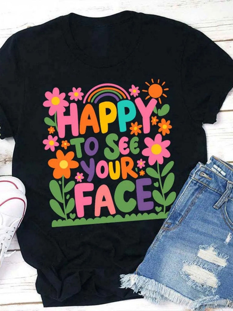 Graphic Shirts For Women Happy Colorful Cheerful Flowers And Rainbow With Bright Warm Sun Face, Cute T Shirts For Women, Women Tshirts