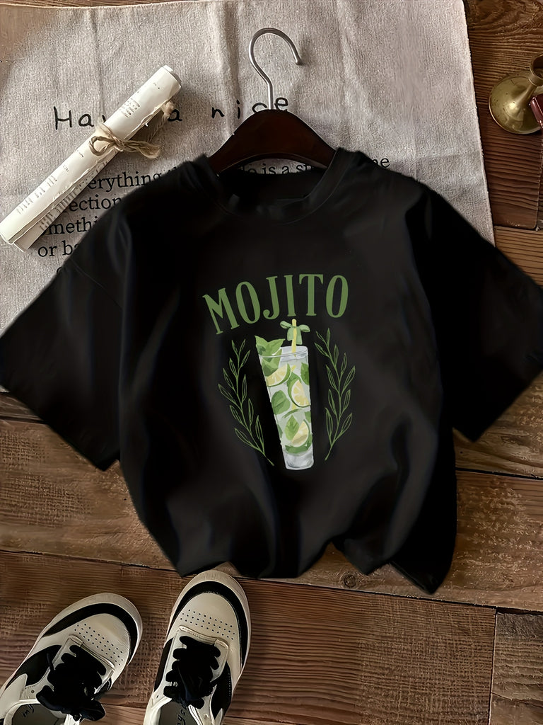 Graphic Tees Women Mojito Glass With Fresh Mint Leaves And Lime On Black T Shirt, Green Shirt Womens, Womens Graphic Tshirts
