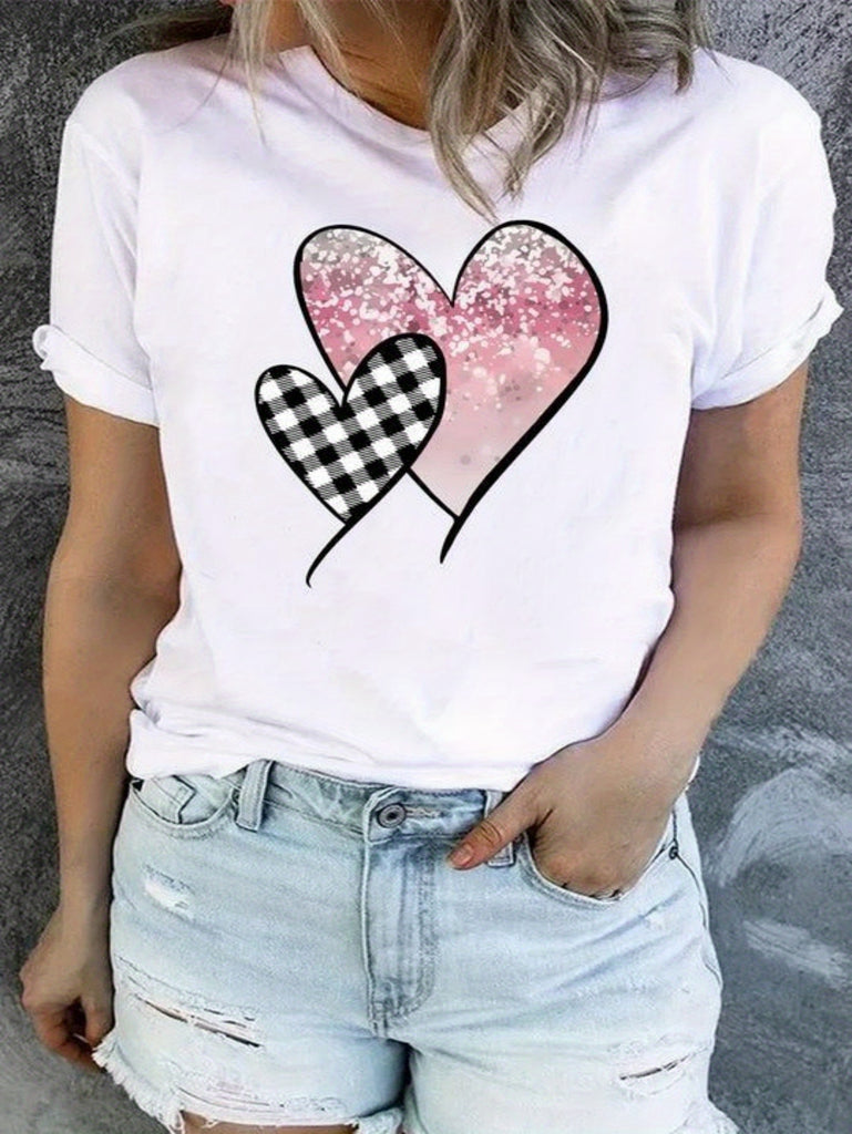 Graphic Tees Women Pink And Black Patterned Hearts Design On White Tshirt, Cute T Shirts For Women, Blue Shirt Women