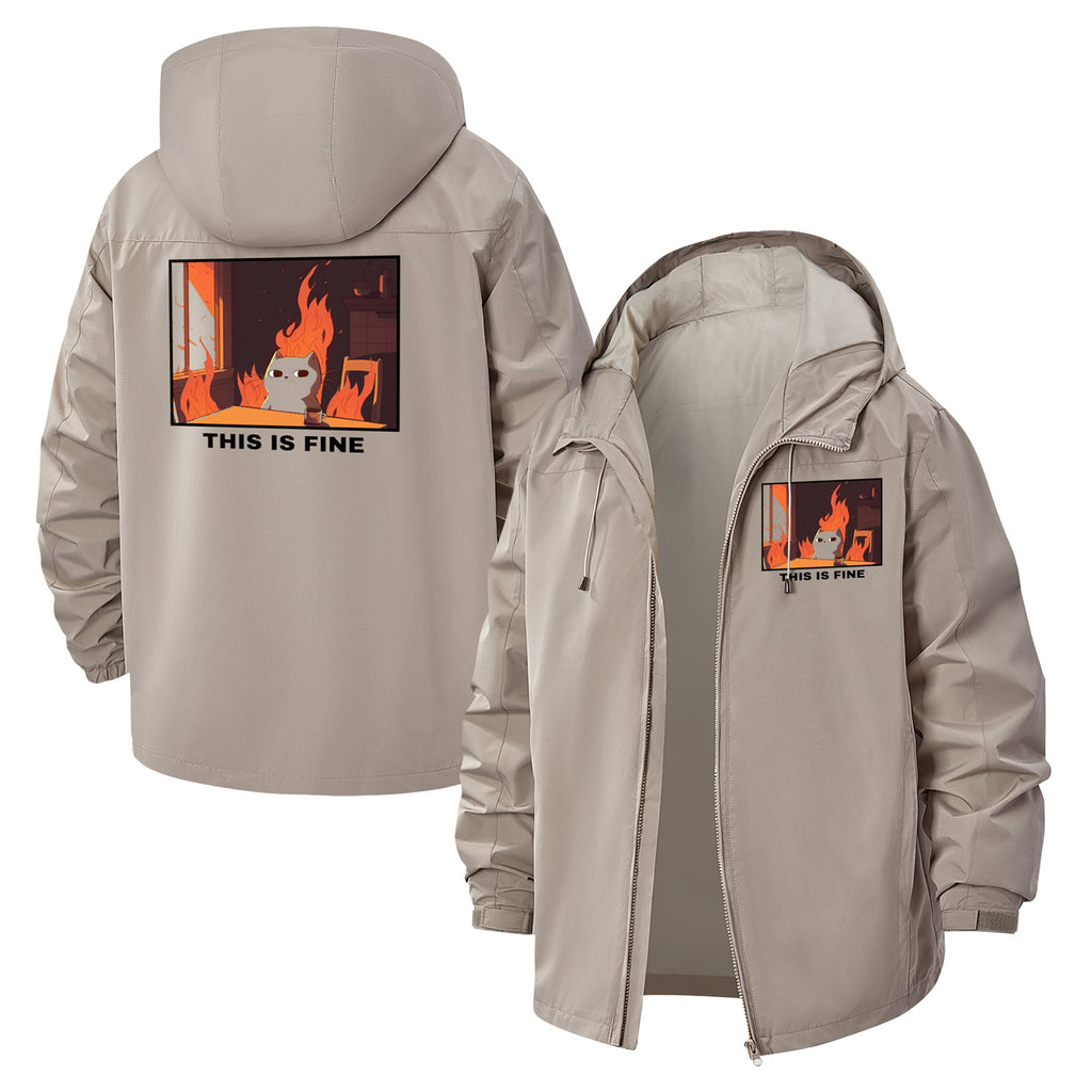 This Is Fine Meme Unisex Full-Zip Printed Waterproof Hooded Windbreaker