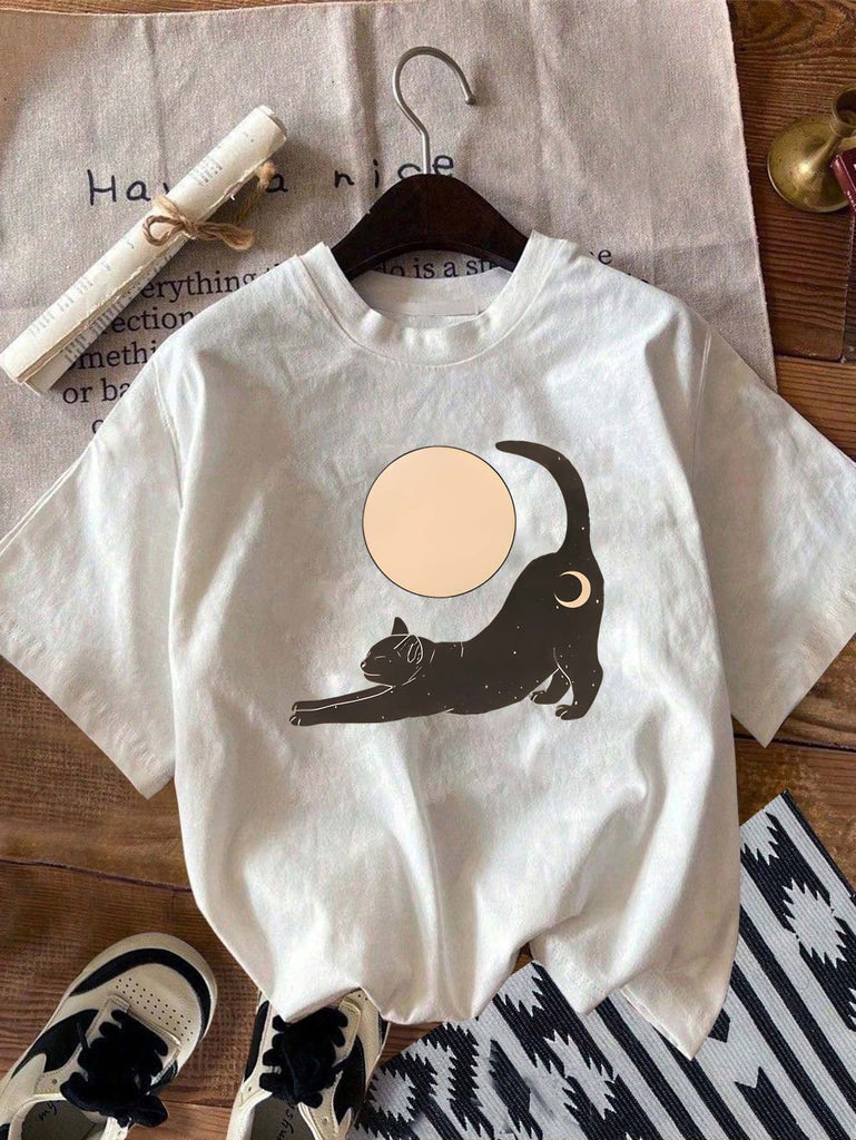 Vintage Shirts Women Playful Black Cat Stretching Under Sunlight T Shirt, 100 Cotton T Shirts For Women, Graphic Shirts For Women