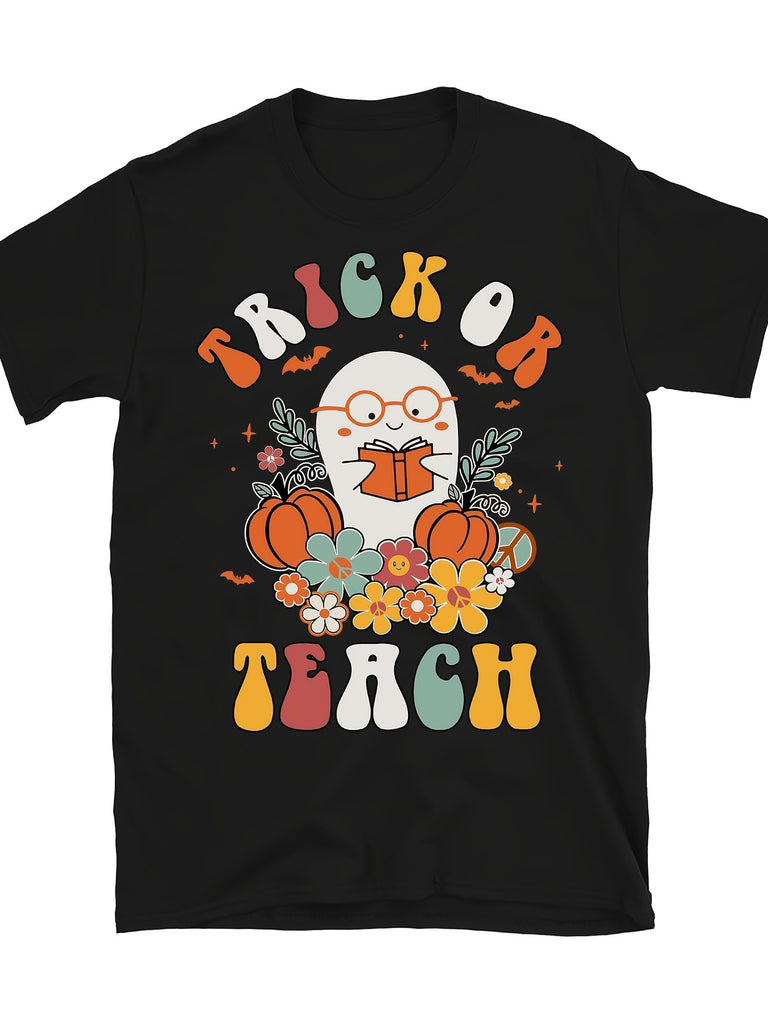 Vintage T Shirts Women Trick Or Treat Cute Ghost With Pumpkins And Autumn Flowers Tshirt, Pink Shirt Womens, Vintage Shirts Women