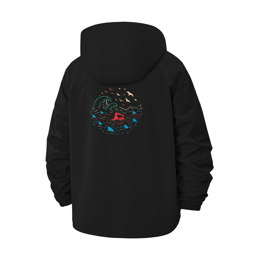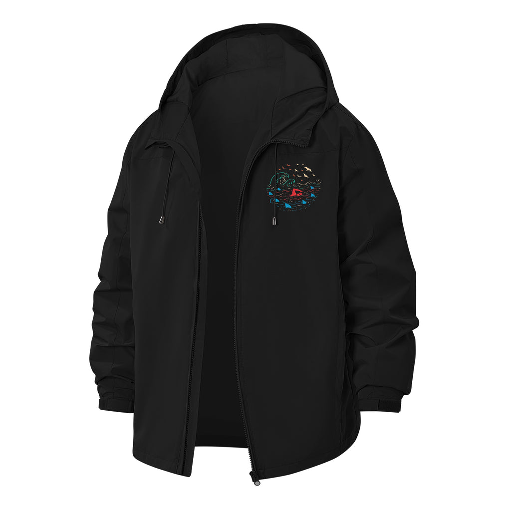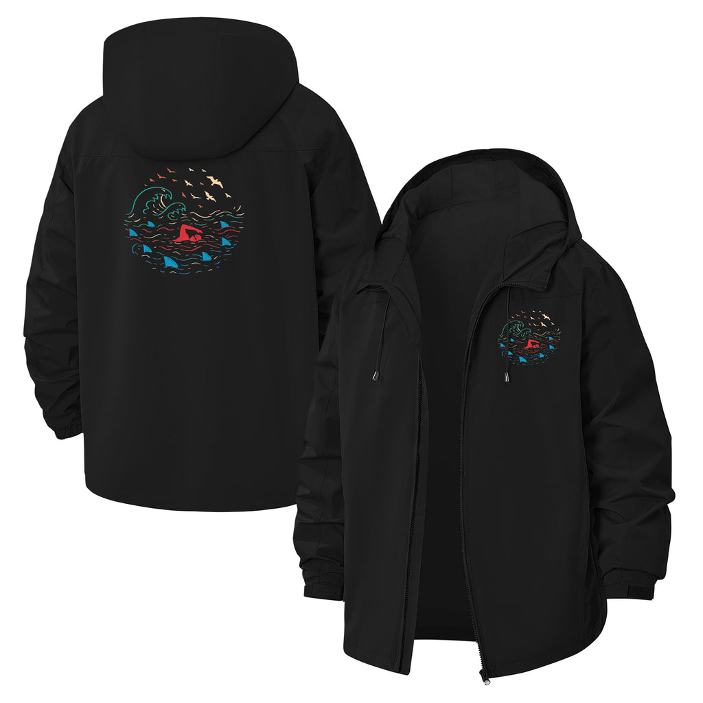 Wave and Boat Art Unisex Full-Zip Printed Waterproof Hooded Windbreaker