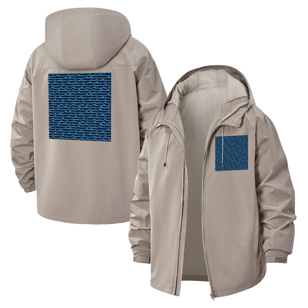 Wave Pattern Unisex Full-Zip Printed Waterproof Hooded Windbreaker