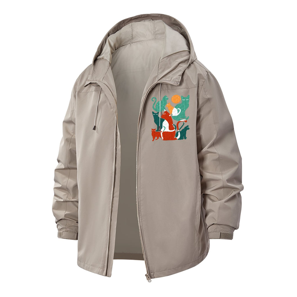 Whimsical Cat Gathering Unisex Full-Zip Printed Waterproof Hooded Windbreaker