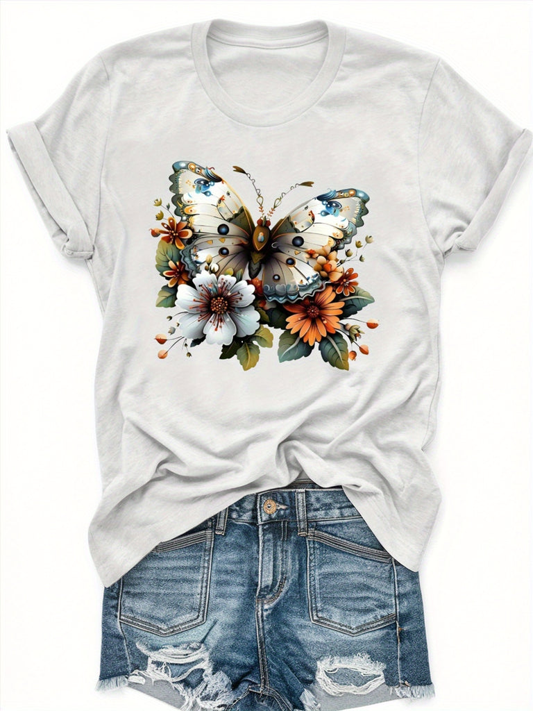 White Cotton Shirt Women Colorful Butterfly Among Orange Yellow White Blossoms Flower, Funny Shirts For Women, Cotton Shirts For Women