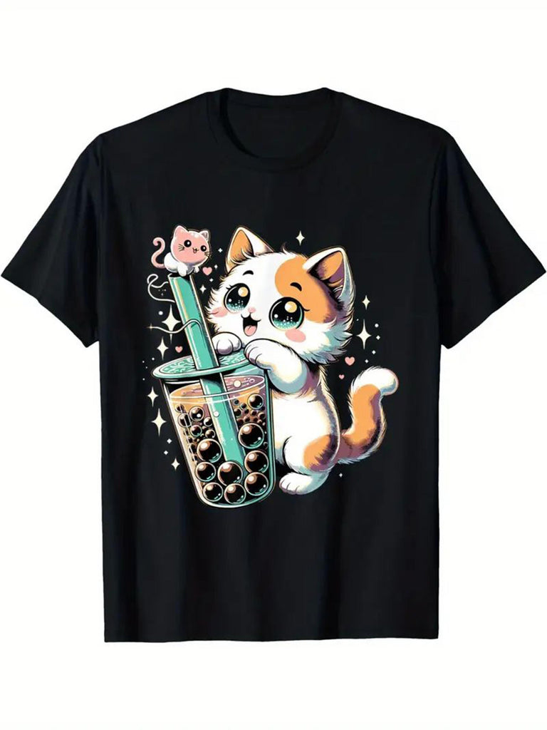 Women Tshirts Adorable Cat Playing With Bubble Tea Among Sparkling Stars Cartoon Cat, Funny T Shirts For Women, Vintage Shirts Women