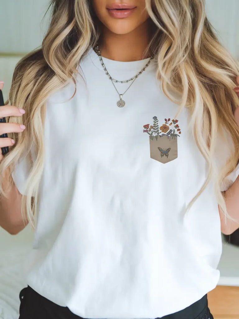 Womens Graphic T Shirts Small Abstract Butterfly And Flowers Blooming On Pocket Tshirt, Graphic Tshirts Women, Basic Tees Women