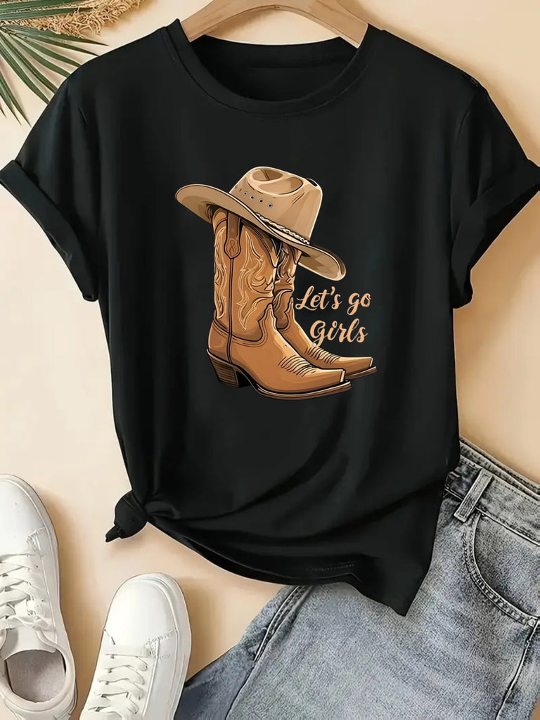 Womens Graphic Tees Vintage Lets Go Girls Cowboy Boots With Detailed Leather And Stylish Hat, Vintage Shirts Women, Women's Short Sleeve T Shirts