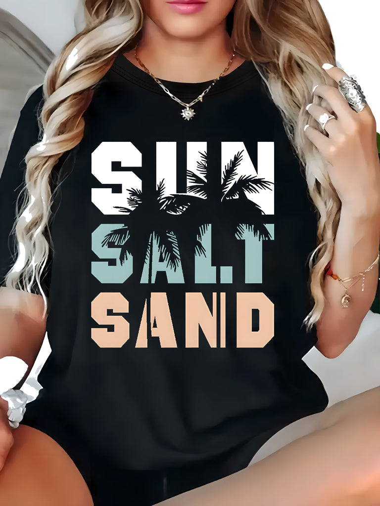 Womens Graphic Tees Vintage Sun Salt Sand With Tropical Palm Tree Silhouettes And Beach Vibes T Shirt, Funny T Shirts For Women, Vintage Shirts Women
