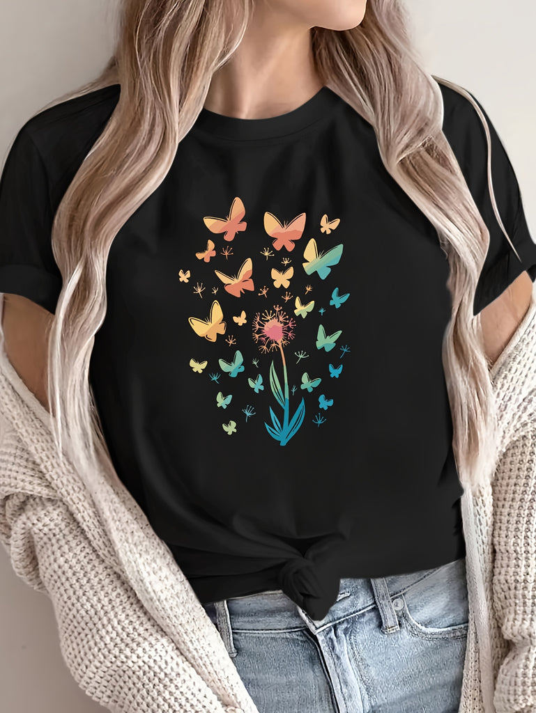 Womens Grinch Shirt Colorful Butterflies Surrounding Blooming Pink Flower, Graphic Shirts For Women, Funny Shirts For Women