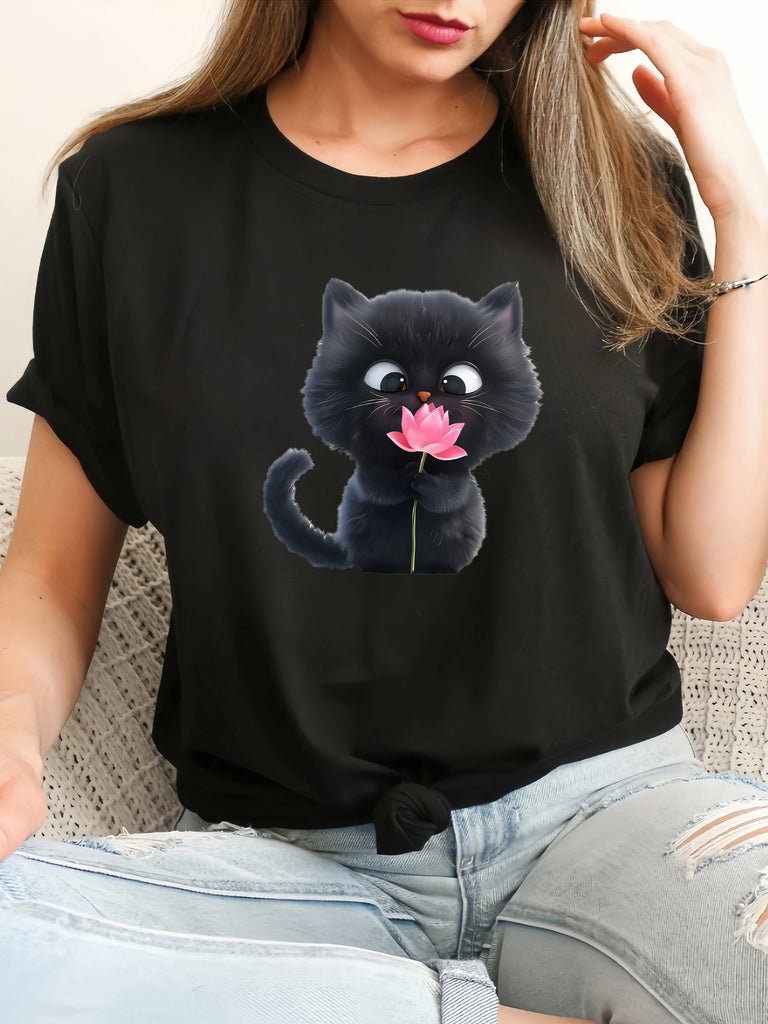 Women's Short Sleeve T Shirts Cute Playful Kitten Holding Pink Flower Black Tshirt, Womens Graphic Tees Vintage, Womens Tees